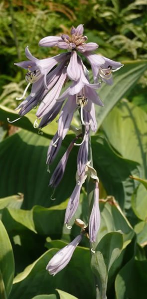 Clumps of large, blue/green leaves are held up on tall stems. Taller spikes bear racemes of pale violet flowers in summer.