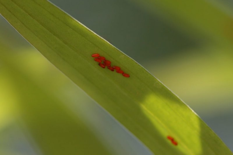 The adult beetles are bright red with a black head and legs, and are up to 8mm in length. Their sausage-shaped eggs are orange-red and usually laid in neat lines on the underside of leaves or on stems. They hatch into reddish-orange, hump-backed larvae which are covered in black slime (their own excrement).