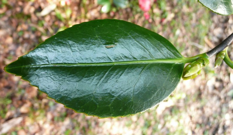 Semi-double flowers with pinkish-red petals (which occasionally have white blotches) and yellow stamens. Dark green, glossy, evergreen leaves with slightly serrated edges.