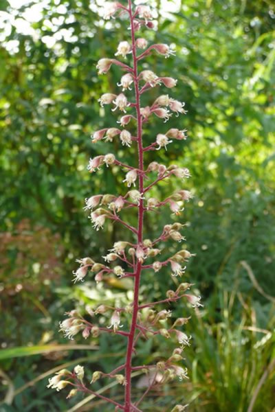 This heuchera has rich bronze/purple leaves which deepen in sun to nearly black. The creamy white summer flowers borne on tall spikes contrast with dark foliage.