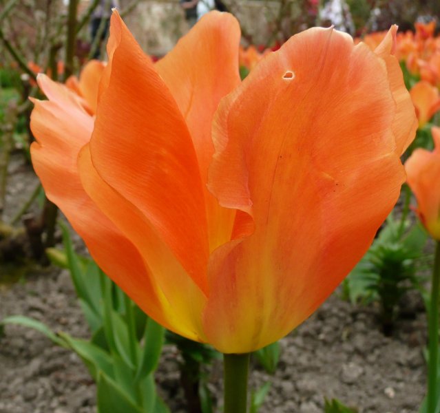 Tulips are grown for their characteristic flowers, in this case a carrot-orange flower with a yellow base and centre. This is a ‘Fosteriana‘ tulip.